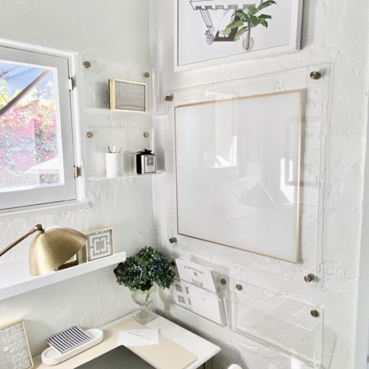 This bright and feminine office features floating wall shelves to hold decor and essentials.