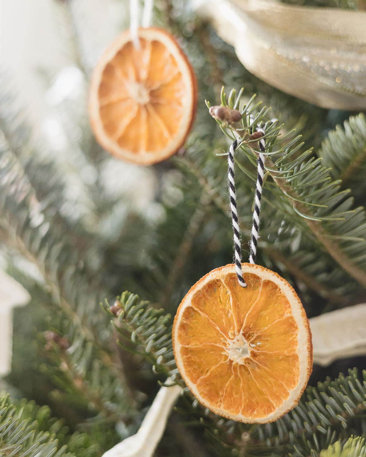 Dried orange slices strung together on twine bring a natural look that feels both eco-friendly and timeless, perfect for recycled holiday tree designs.
