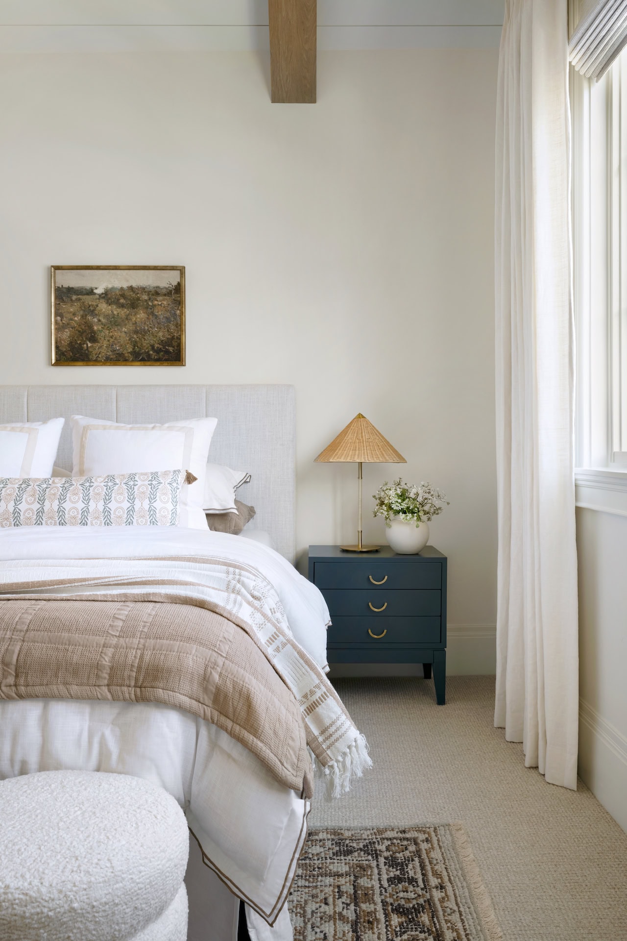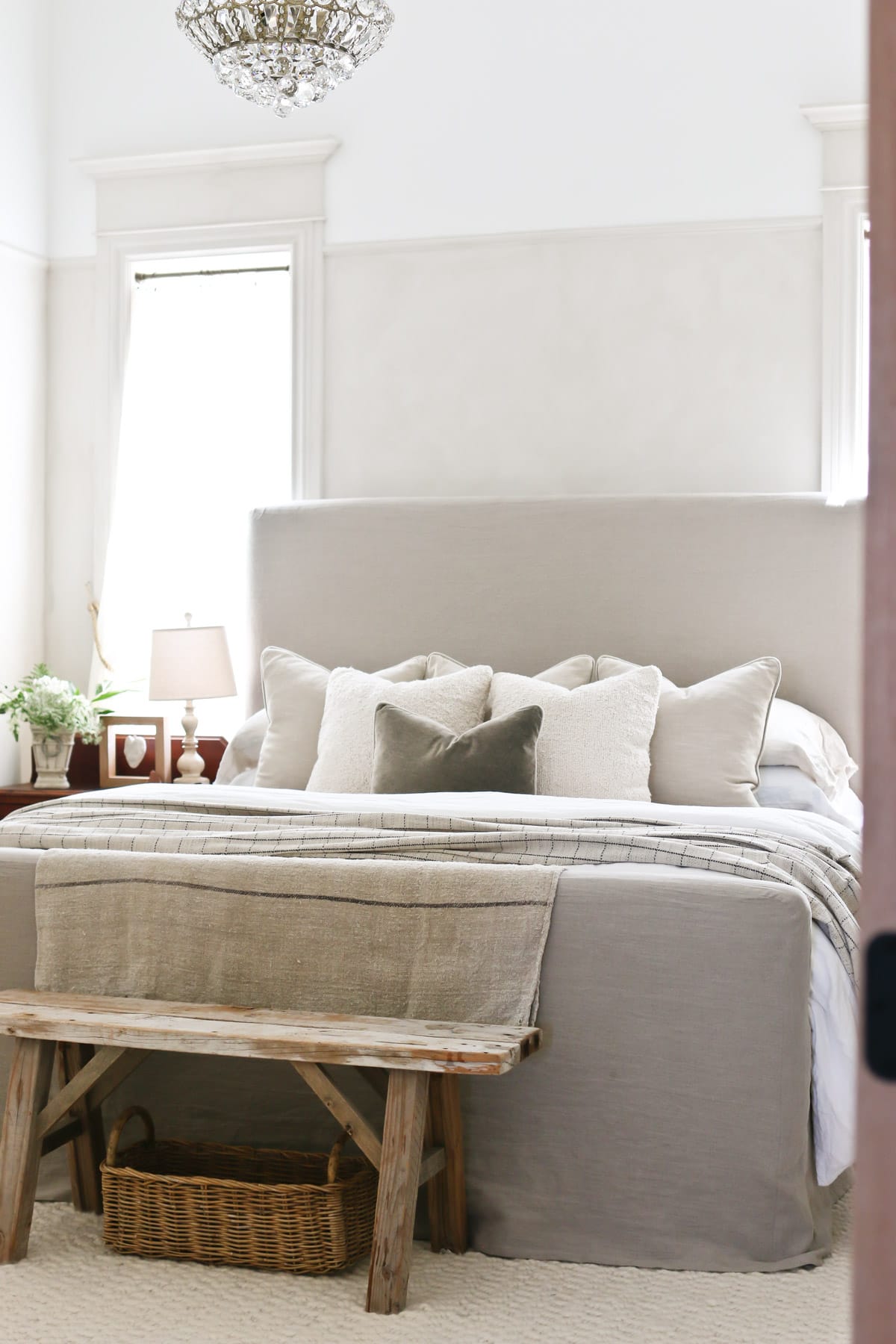 Pillows can stay minimal, and keeping in mind how to layer pillows, just a couple for sleeping and maybe two decorative ones create a finished look that’s still practical.