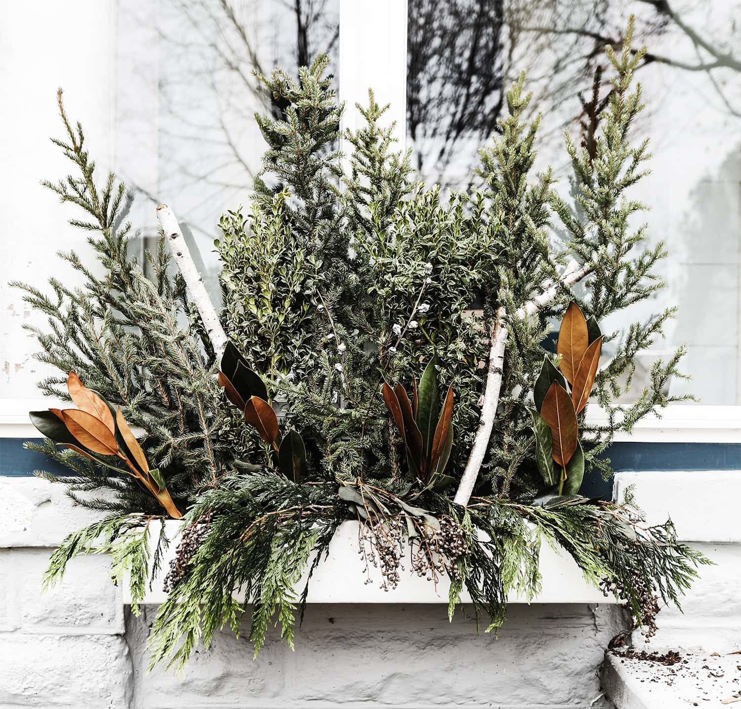 The right greenery will carry your window boxes through the whole season while keeping them looking natural, full, and welcoming on even the coldest days.