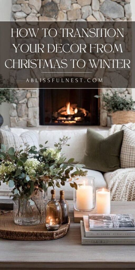 Keep white decorations, cozy blankets, candles, pinecones, bare branches, and soft lighting for winter. Natural elements and neutral pieces work beautifully without feeling like leftover Christmas decorations.