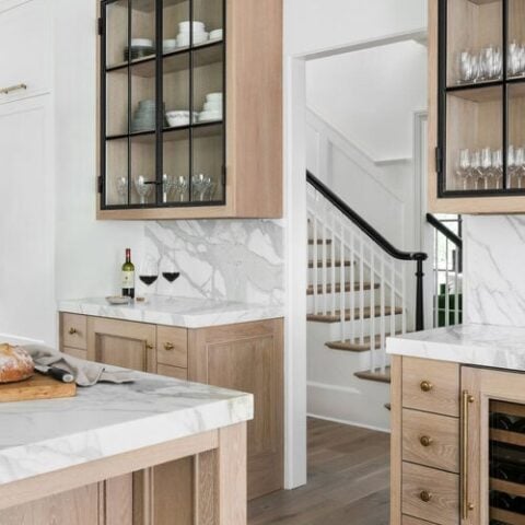 The light wood cabinets with marble countertops and black-framed glass cabinets add a touch of drama without going overboard.
