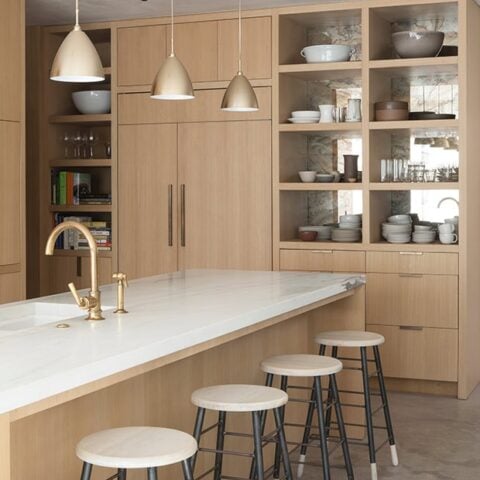 I love how these light wood cabinets have that natural, effortless look with open shelving for a relaxed feel.