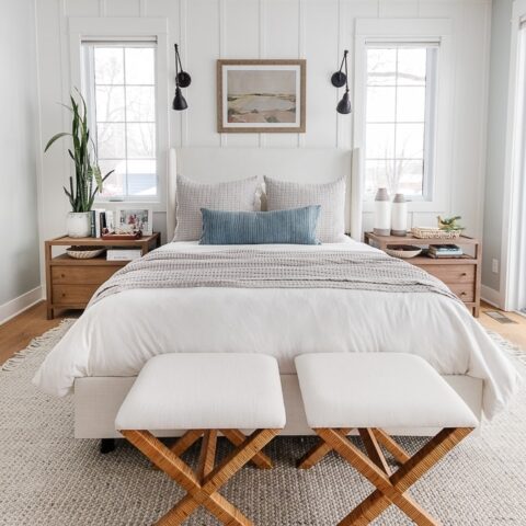 The goal is to make your room feel open and breathable while still looking polished, like a modern beach house bedroom.
