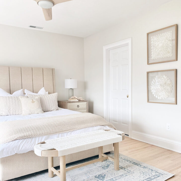 A natural jute rug, coastal-inspired artwork, and soft neutral bedding all work together to bring a relaxed beachy energy right into your room.