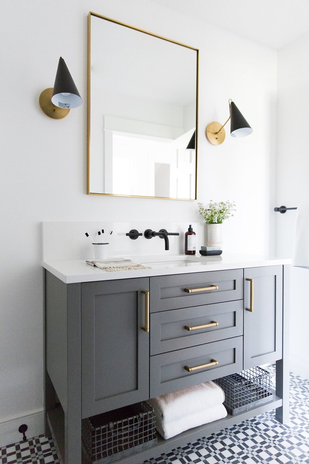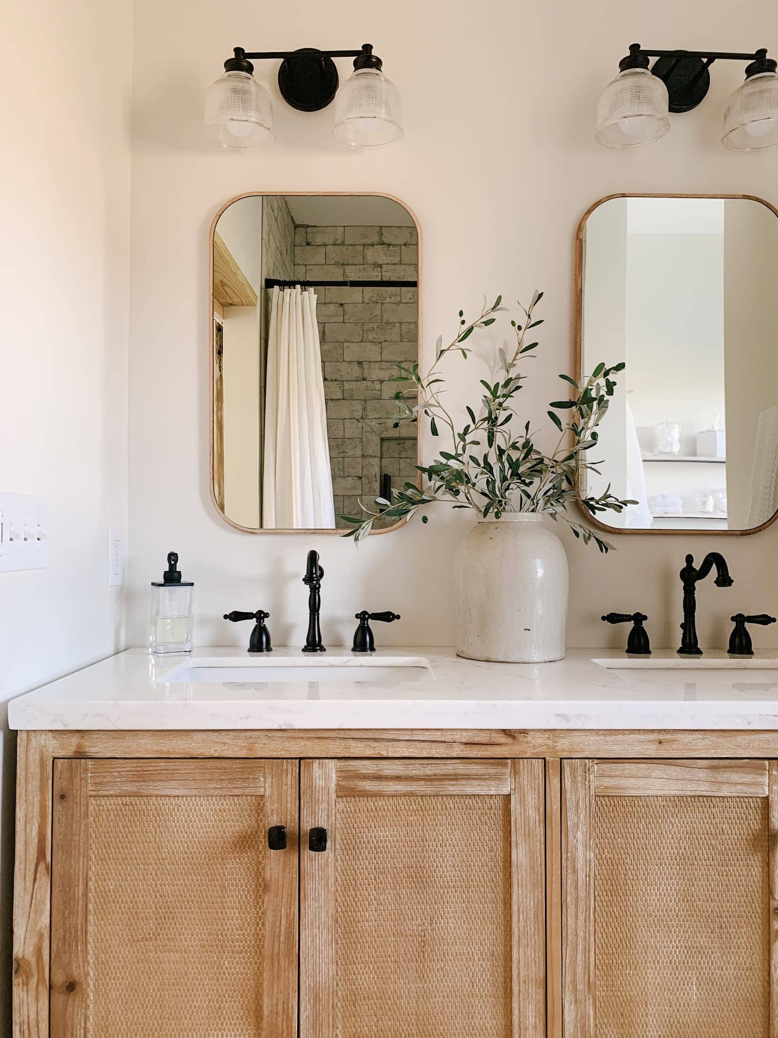 Wall sconces on both sides of the mirror give even light for getting ready and also bring in that farmhouse look without feeling overdone.