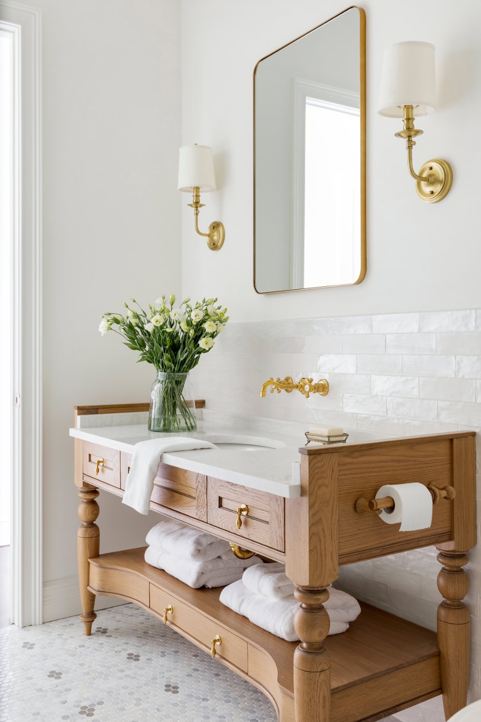 A wood vanity often becomes the main focal point, offering storage space while also adding style and interest to the room’s design.
