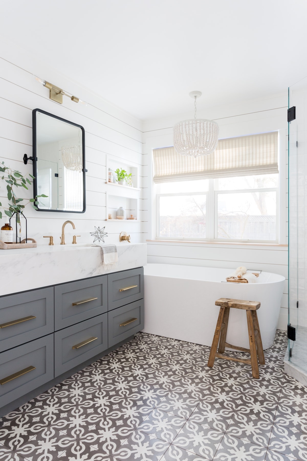 The floor in a farmhouse-style bathroom makes a big difference since it sets the tone for how the whole space feels and works.