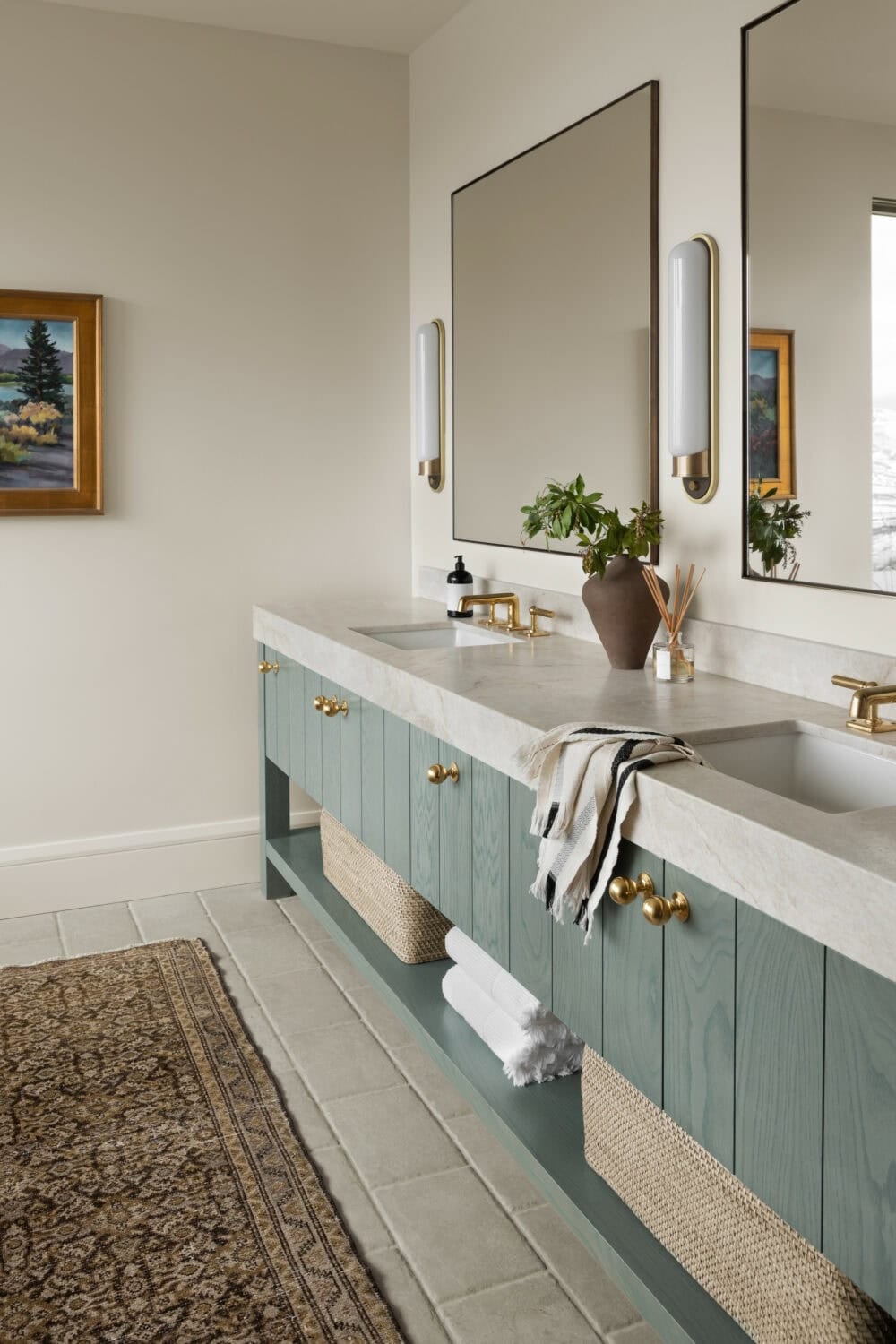 Open shelving built into the vanity gives storage space while also showing off baskets, towels, or small accents that add everyday function to the room.