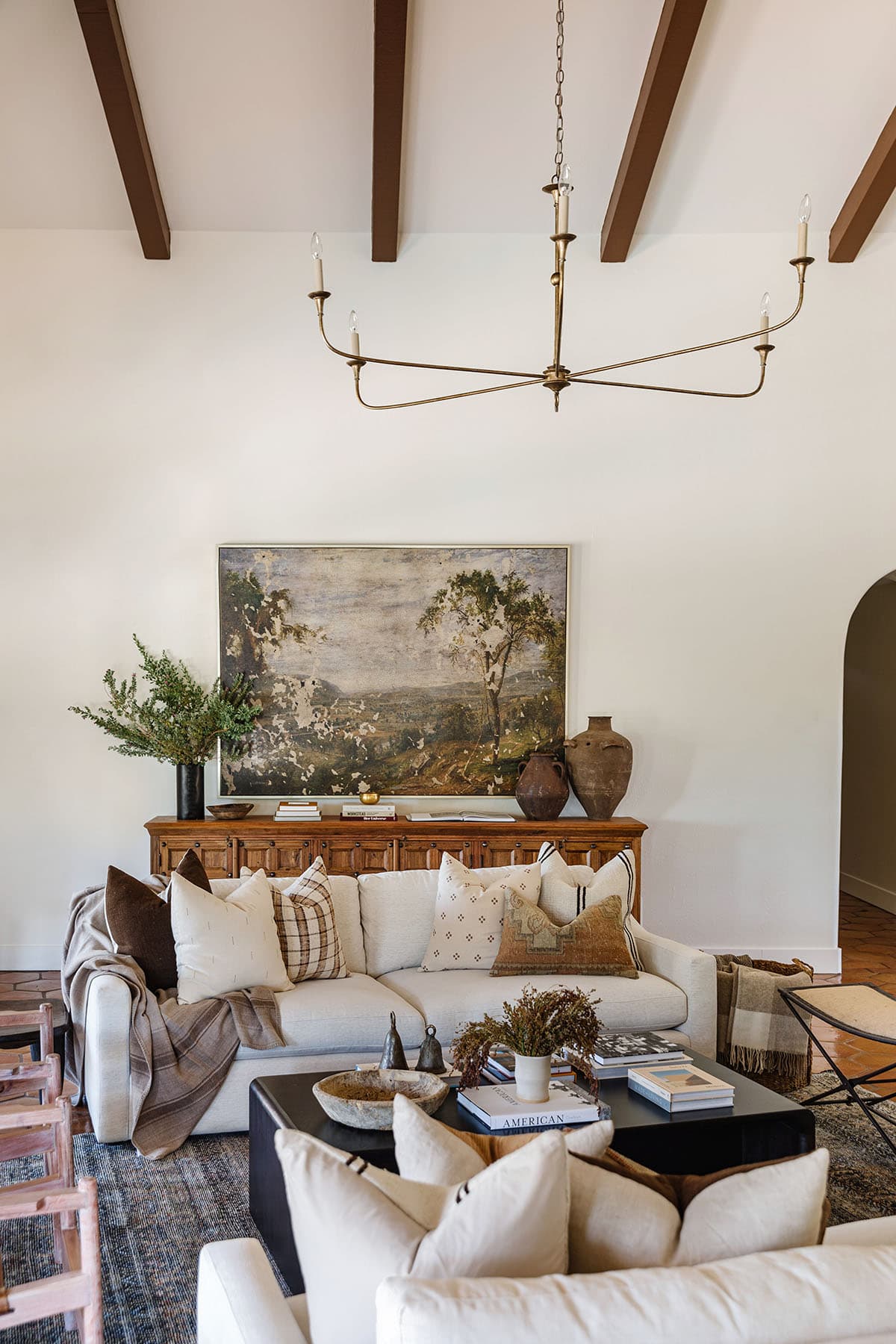Layered textures like wool rugs, velvet pillows, and natural wood finishes help create warmth and make the space feel thoughtfully collected over time.