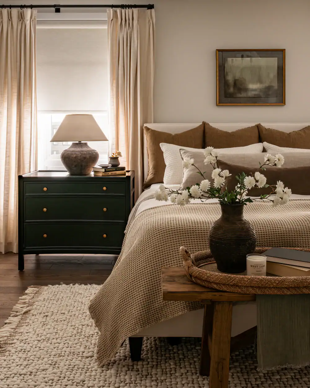 Natural wood, linen, wool, brass, ceramic, and stone create texture and warmth while feeling both timeless and grounded. These materials age beautifully and feel authentic over time.