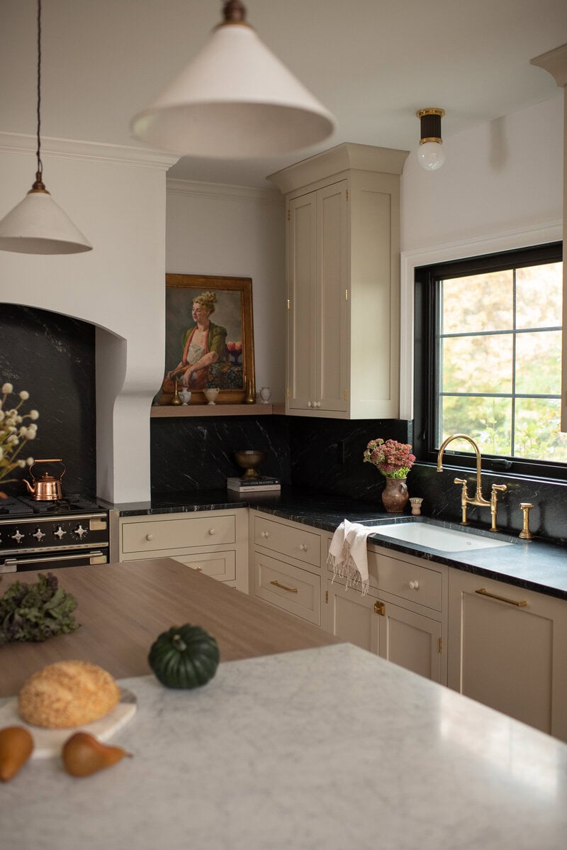 Paint your cabinets in a soft heritage green or warm gray and pair them with brass hardware for a timeless but fresh feeling.