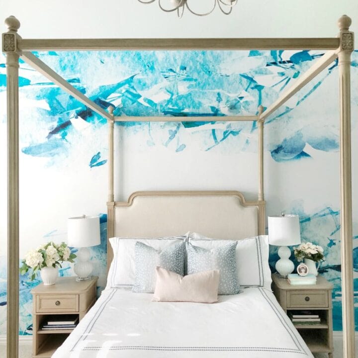This bedroom feels like stepping into a beachy getaway with those gorgeous blue watercolor vibes on the wall and the neutral furniture that keeps things fresh and airy.