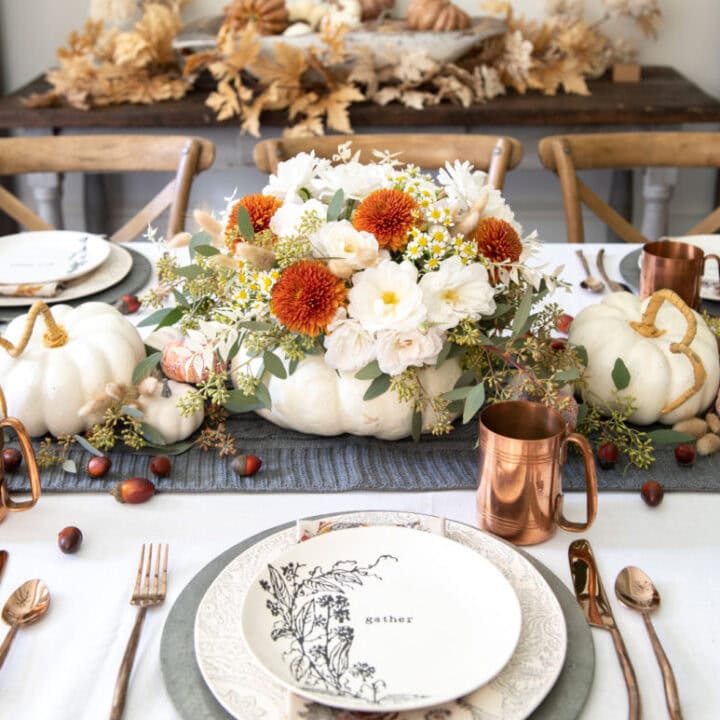 This tablescape is so stylish, with warm fall colors, white heirloom pumpkins, and bright orange blooms that add a fresh and cozy vibe.