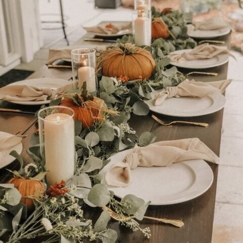 This Thanksgiving table is rocking a super simple yet stunning setup with mini pumpkins in eucalyptus leaves, topped off with candlelight.