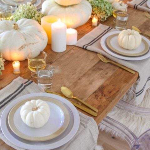 White pumpkins paired with soft candlelight and dried hydrangeas bring a calm and clean look to the table.