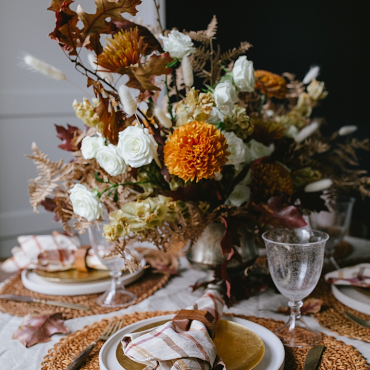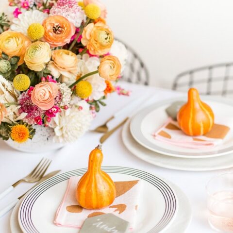 This is great if you want your table to feel lighthearted and cozy, with a pop of color that’s perfect for a cheerful Thanksgiving!