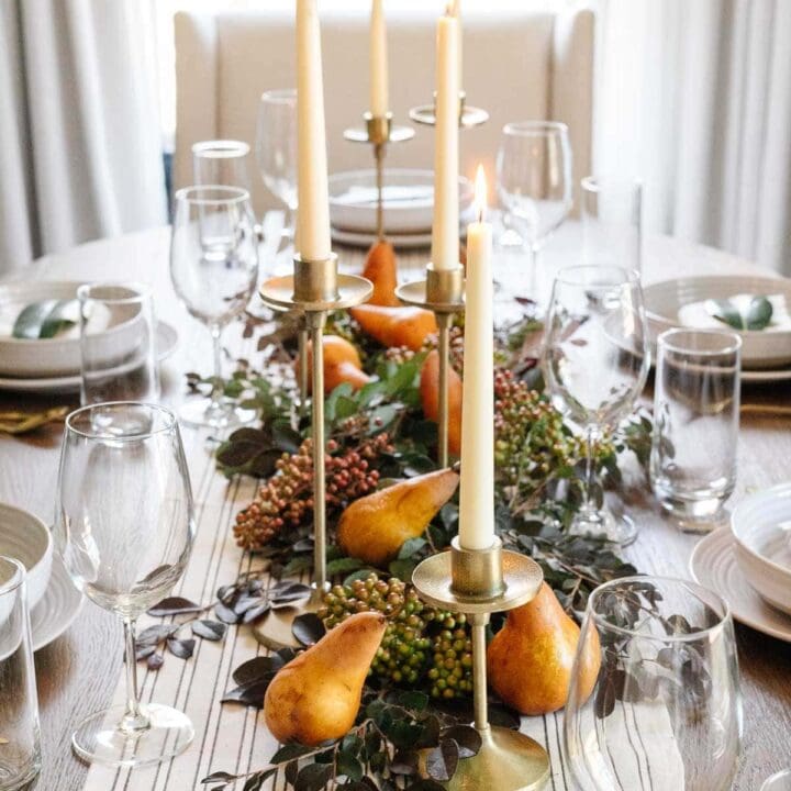 Make your table setup simple yet elegant with these beautiful decorations, such as candles, pears, and rich green leaves that create a beautiful centerpiece.