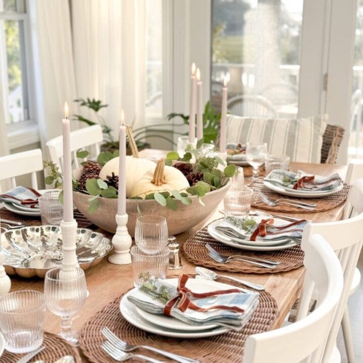 Soft natural linens paired with rattan placemats and a simple centerpiece of white pumpkins and eucalyptus make this Thanksgiving table feel warm and inviting.