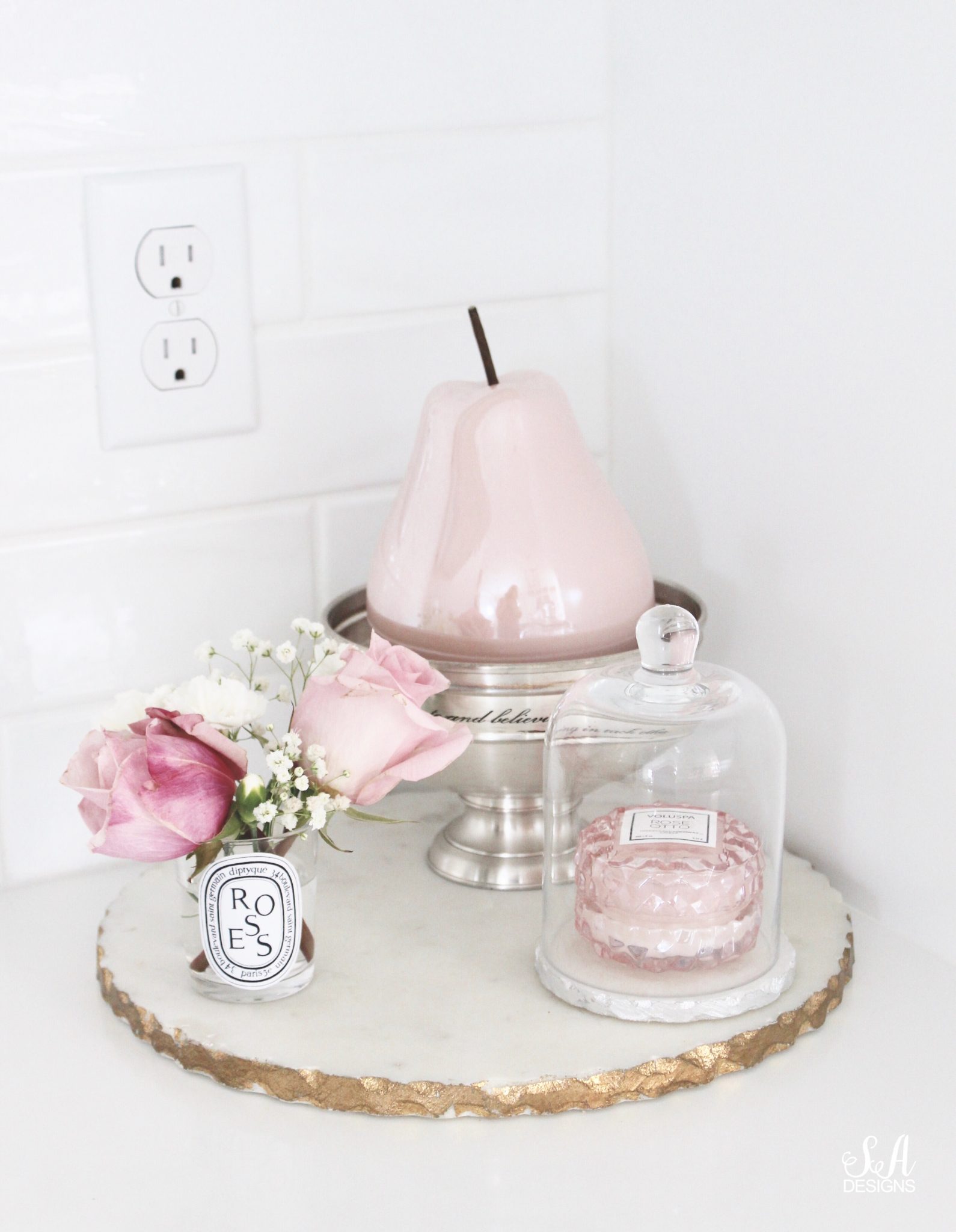 Candles in coordinating colors grouped together on a tray create ambiance and warmth while keeping your surfaces looking clean and organized.