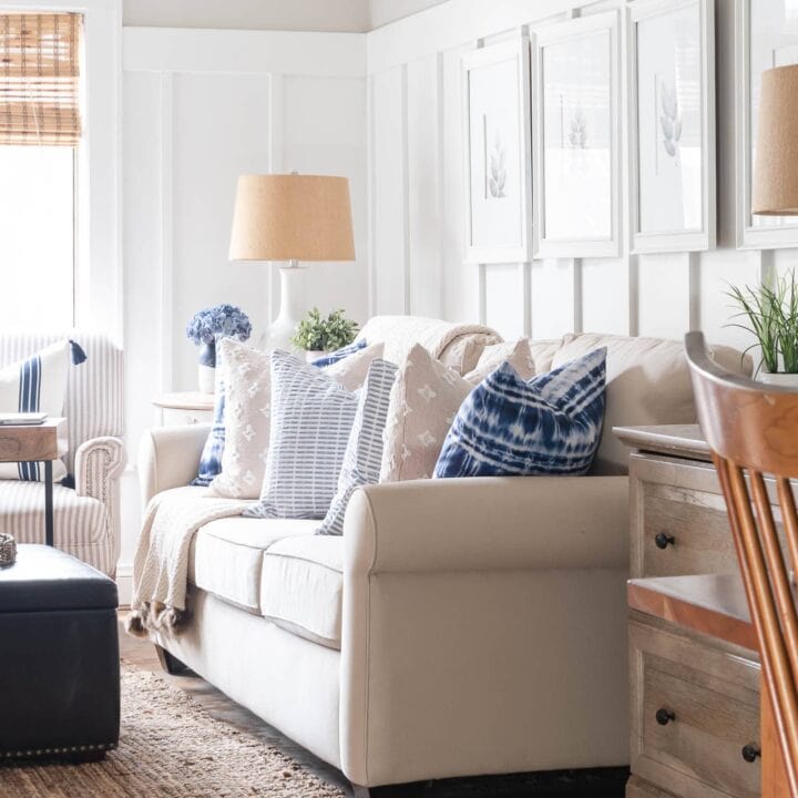 The beige sofa paired with patterned blue pillows gives off a relaxed but polished look.