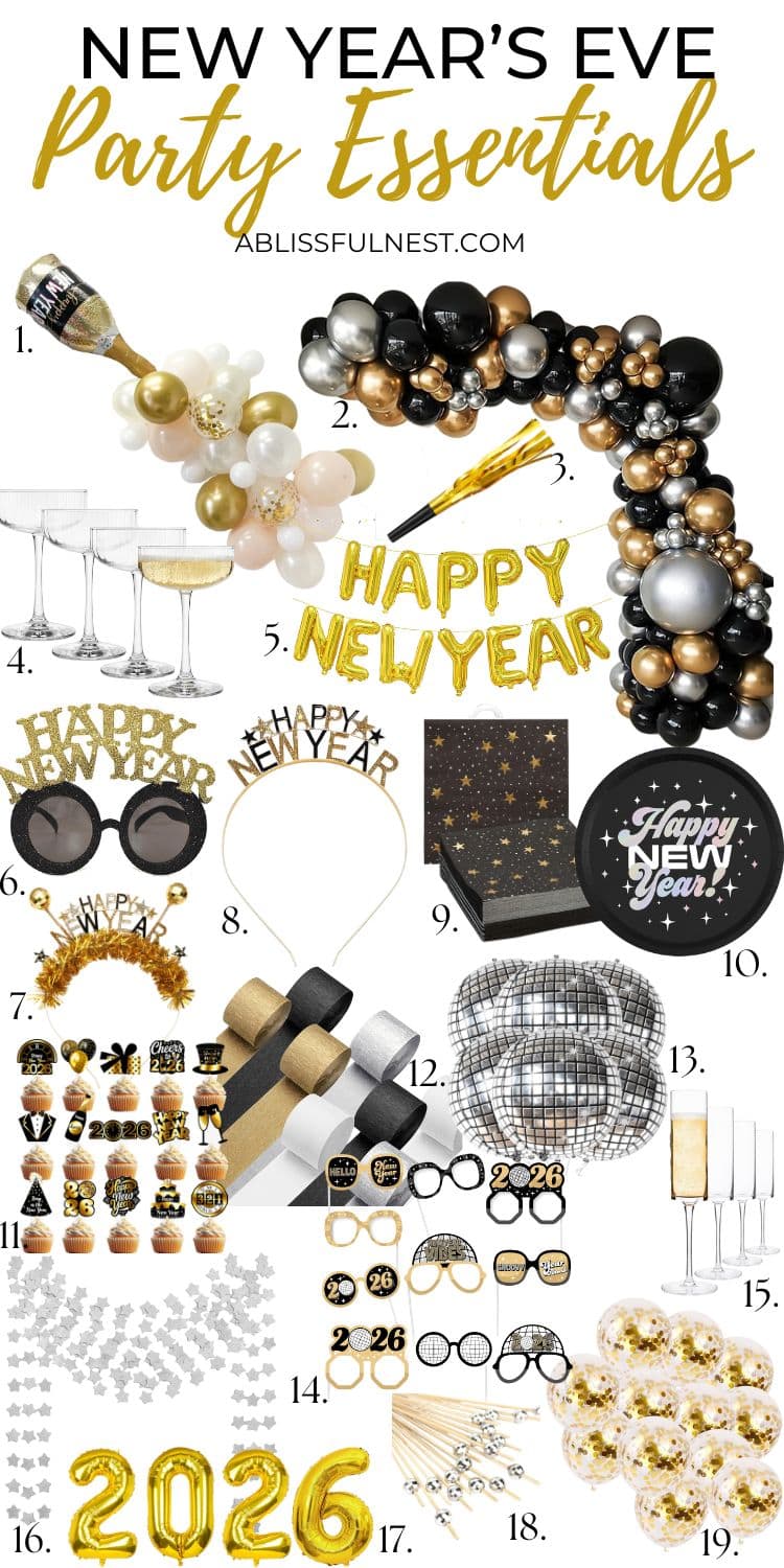 All of these decor finds will ship in plenty of time before New Year’s Eve and they are all super affordable finds too! From festive gold and silver balloons to 2026 balloons, the most beautiful champagne glasses, and more, there’s lots of beautiful NYE party decor here for you to choose from!