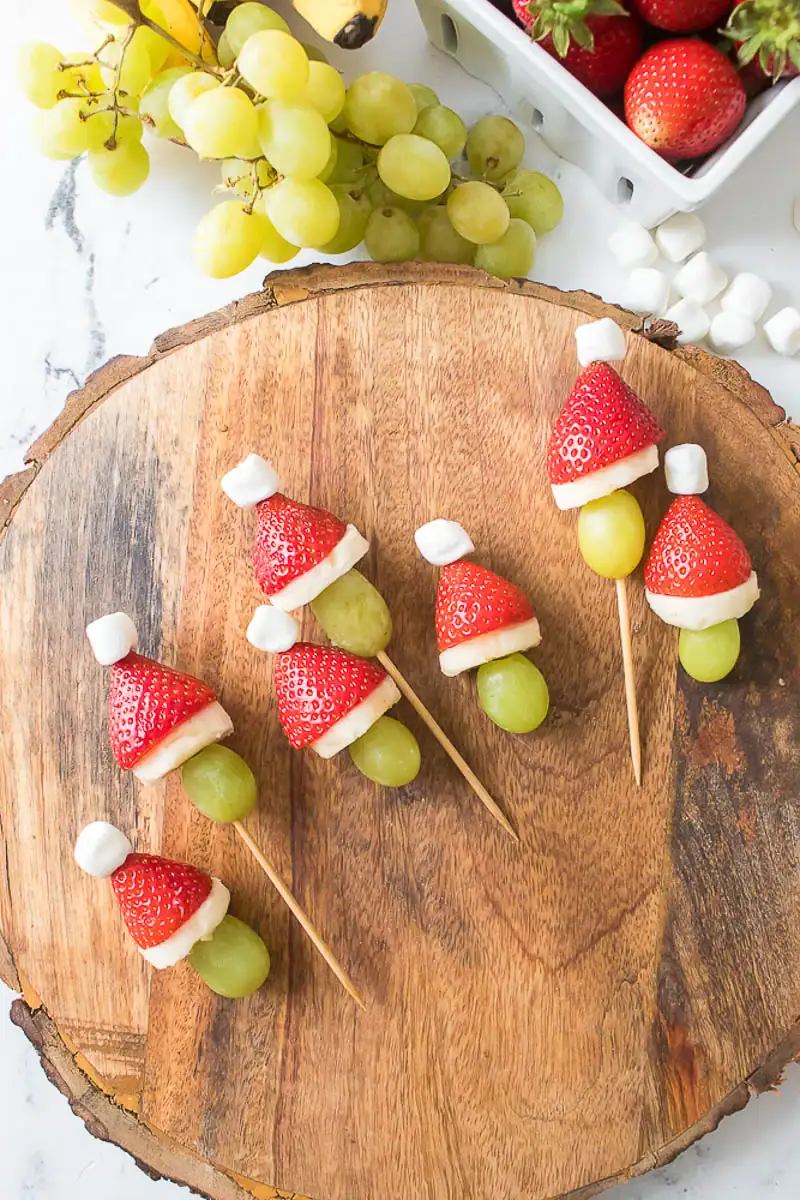 Fruit kabobs with grapes, strawberries, and melon chunks look so festive and colorful, plus they are healthy, which makes you feel good as a parent.