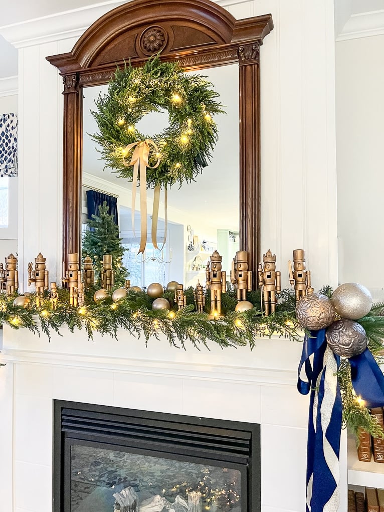 Add fairy lights or candles along the mantel to give your festive mantel nutcracker display a warm, cozy glow in the evenings.