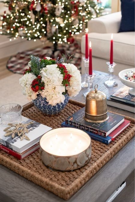 Deep reds, hunter green, navy, and warm neutrals like camel and ivory are the core of this cozy, timeless holiday style. These rich colors pair beautifully with brass candle holders, leather details, and soft velvet to create a layered and elegant look.