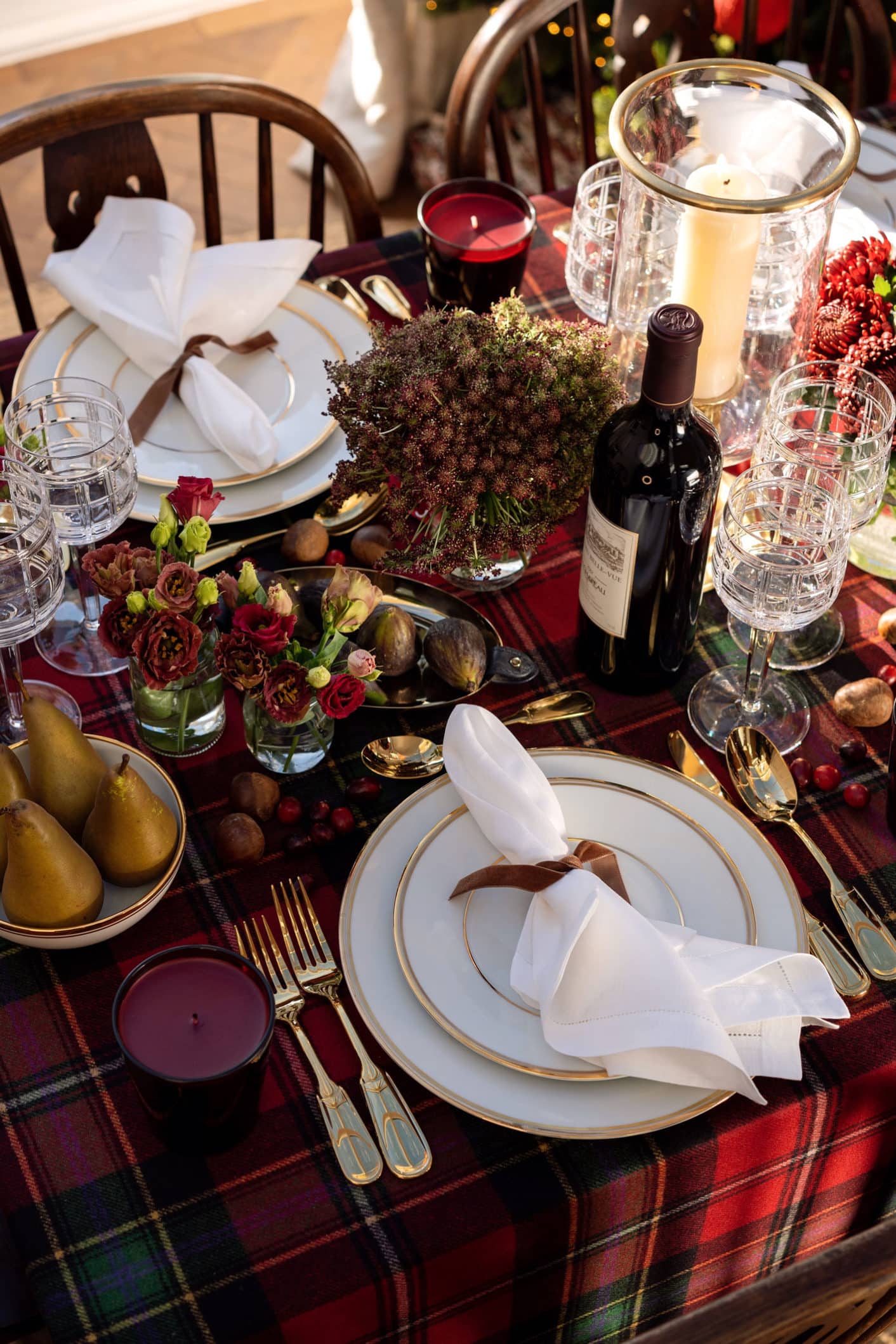 To set a beautiful holiday table with Ralph Lauren inspiration, start with a tartan plaid tablecloth or runner to bring in that classic holiday style.