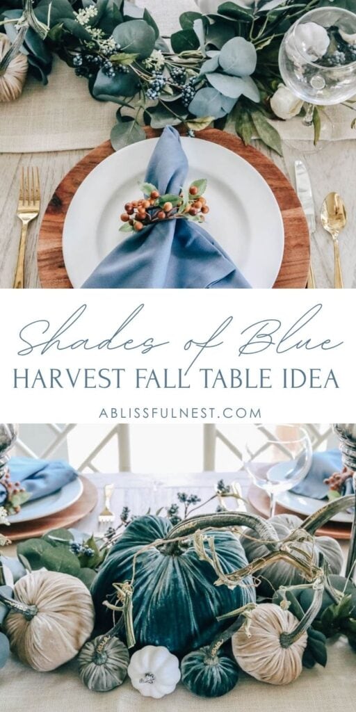 The blue tones add a fresh twist to traditional fall colors, keeping the table from feeling too predictable or overly heavy.