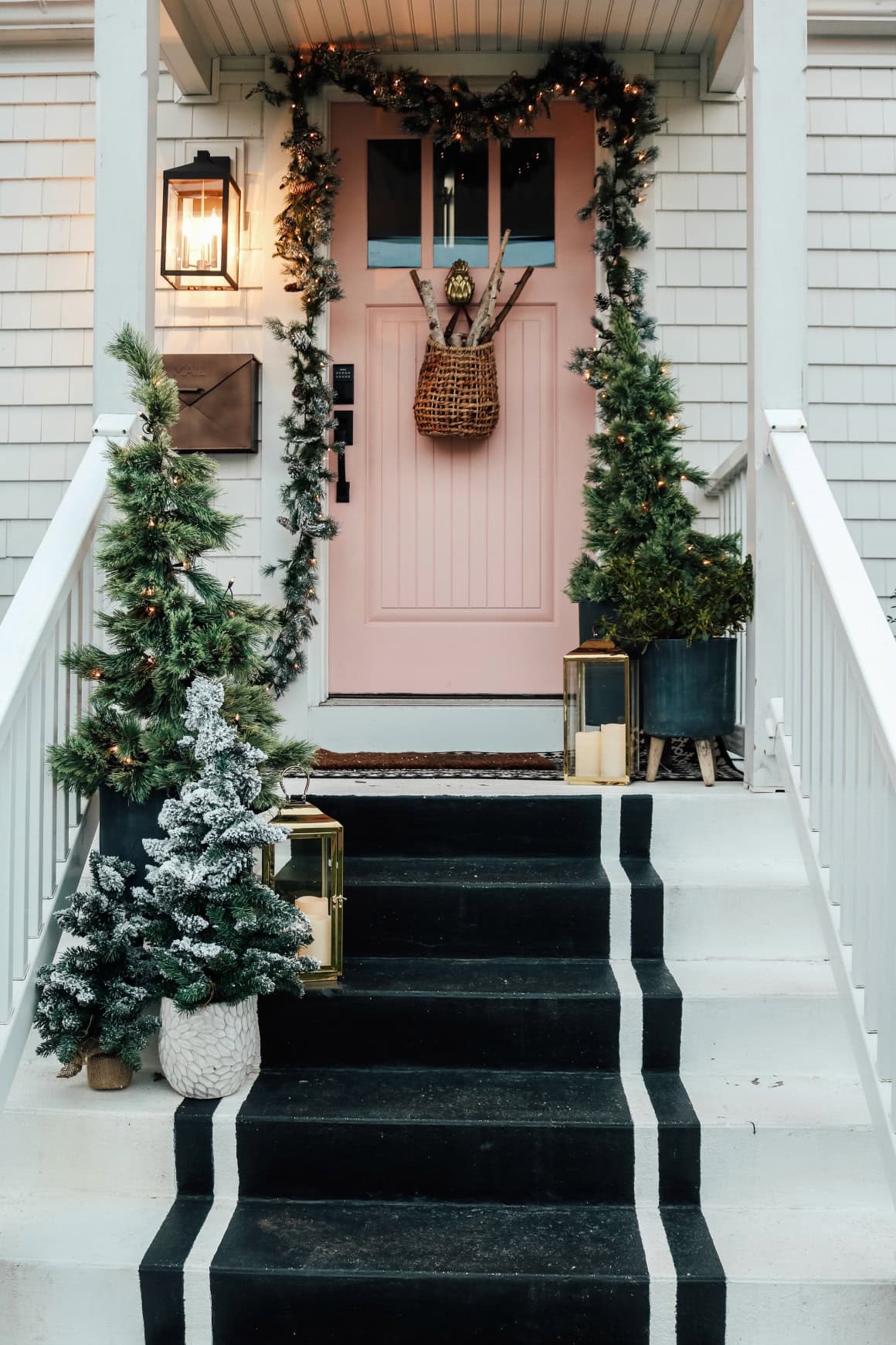 Try layering garlands around railings with outdoor Christmas lights for porches, combining greenery and sparkle to create a magical glow that looks beautiful at night.