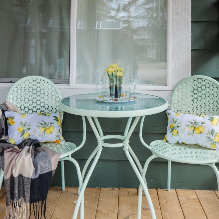This porch looks so cheerful with mint green chairs, lemon-print pillows, and a little table perfect for drinks or snacks with a friend.