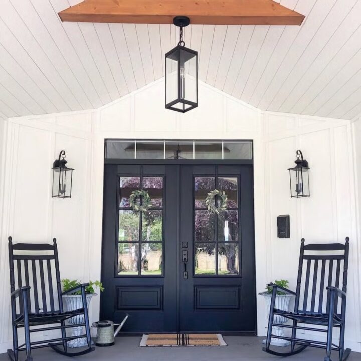 Black rocking chairs and matching double doors give this porch a bold look that still feels calm and classic with the simple white walls around it.
