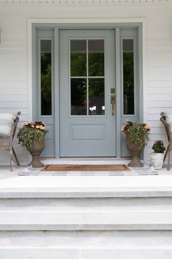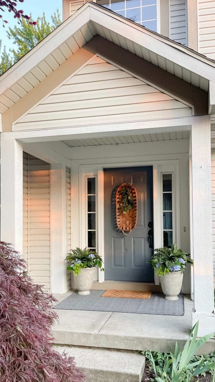 Matching stone planters filled with ferns and seasonal blooms flank the door and tie in with the muted gray-blue paint.