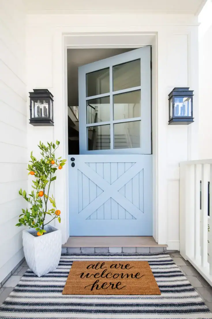 A small citrus tree in a textured planter adds a bright and playful vibe to this cheerful blue door.