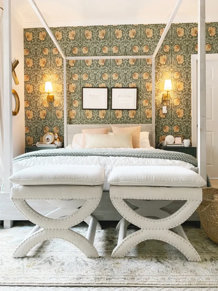 Patterned wallpaper with golden flowers, a canopy bed, and cushioned stools create a stylish setup that feels grown-up but still playful.