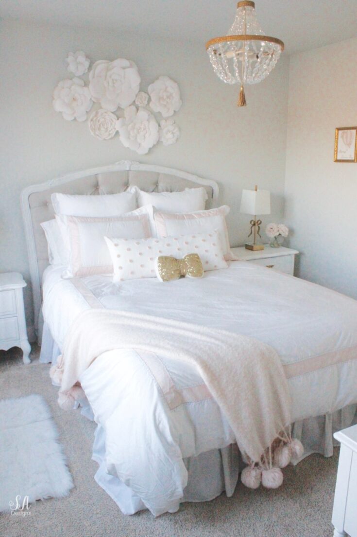 Blush pillows, a glittery bow accent, and a crystal chandelier give this bedroom a soft, glamorous vibe.