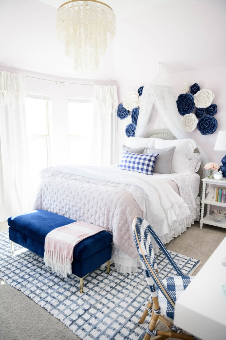 Navy and white flower accents with a velvet bench and layered ruffled bedding make this bedroom bright and stylish.