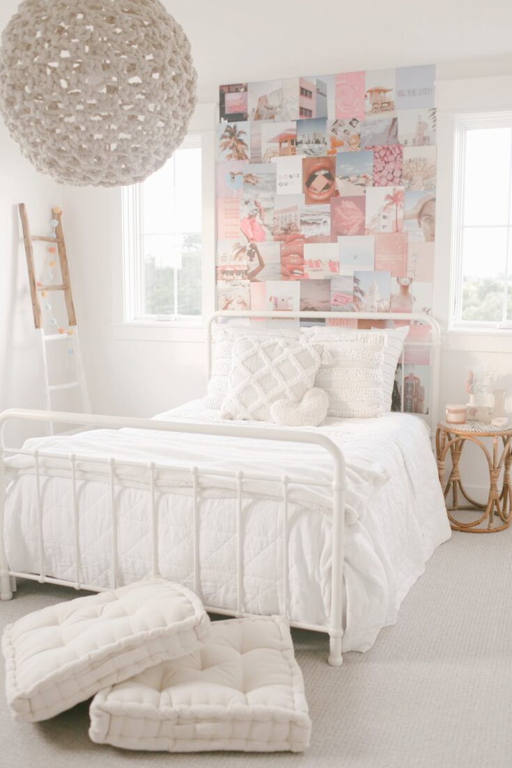 A collage wall full of pink prints adds energy and fun, paired with white bedding and textured pillows for balance.