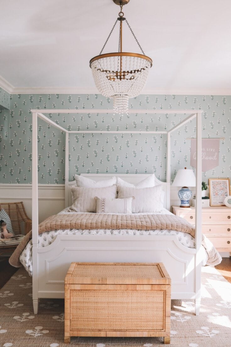 A canopy bed, floral wallpaper, and wicker chest give this bedroom a cozy, timeless look that’s still playful.