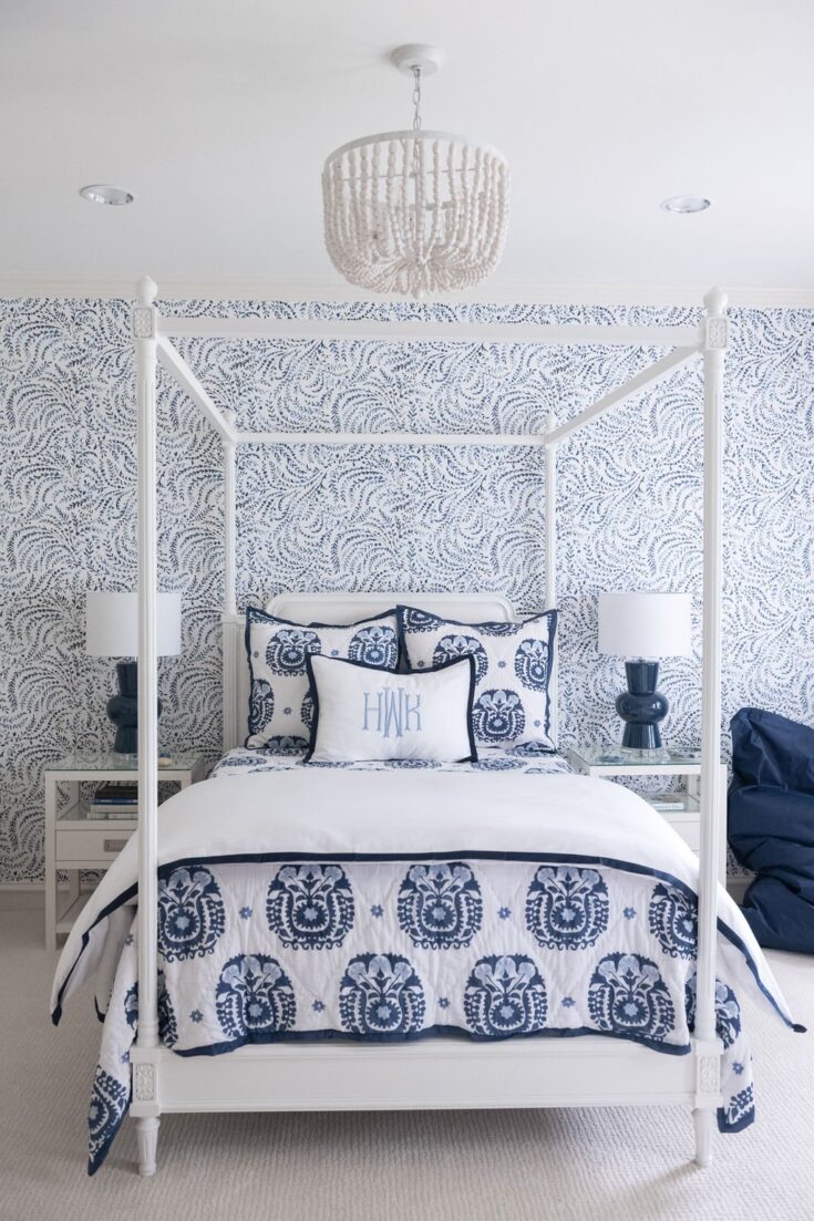 Blue-patterned wallpaper, matching bedding, and a crisp white canopy bed make this room lively and refreshing.