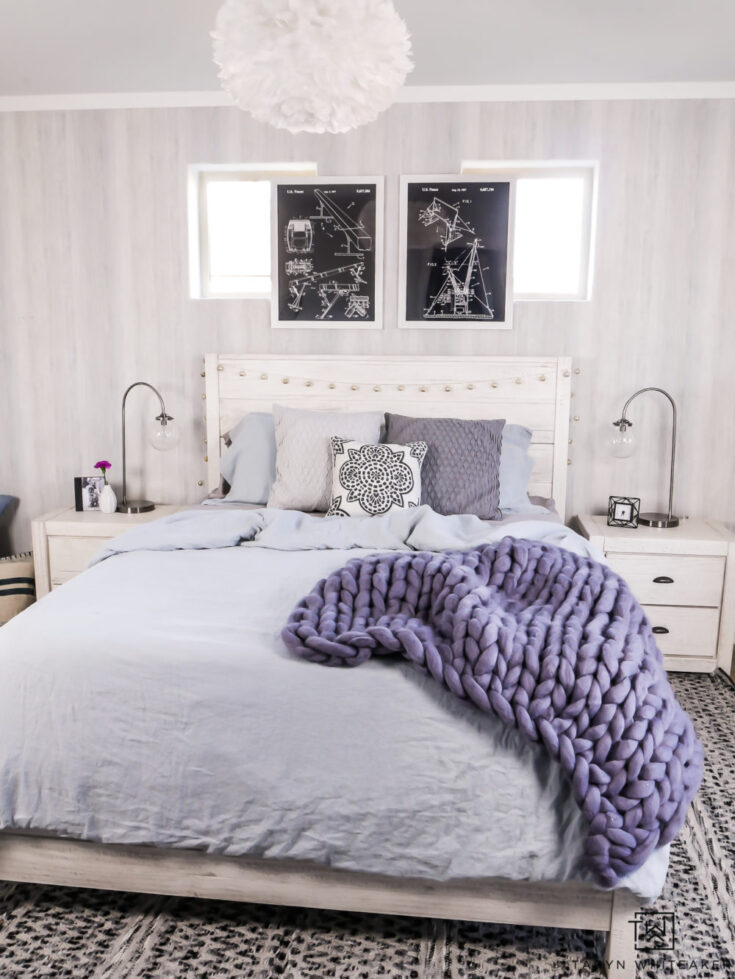 Star-themed artwork, soft gray walls, and a chunky lavender blanket create a modern yet cozy bedroom look.