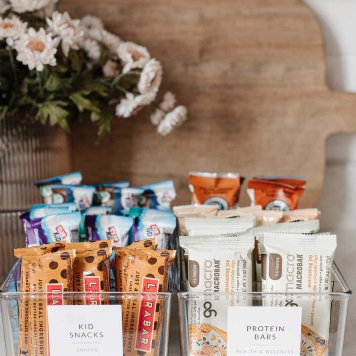 Create a kid-friendly bin with healthy options they can reach on their own. Use smaller containers to avoid spills and keep things portioned. Add fun labels or a chalkboard sign so they know which snacks are for them and which ones are off-limits.