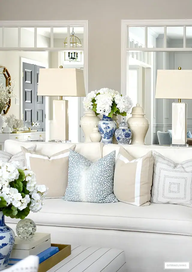 Once you have that neutral base, then you can add pops of spring color through pillows, throws, artwork, or small decor items without the room feeling too busy or chaotic.