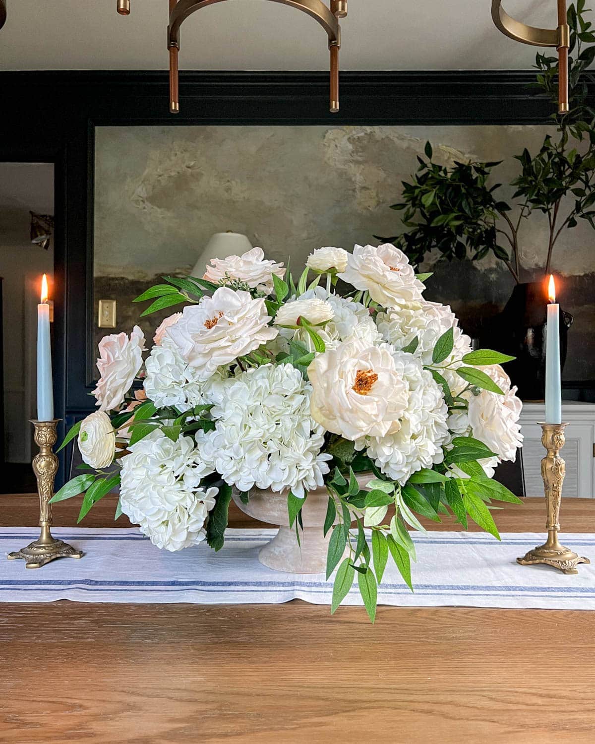 White hydrangeas and trailing eucalyptus are a match made in spring heaven, and this faux version styled in a woven cane vase captures that fresh, garden-party energy so beautifully.