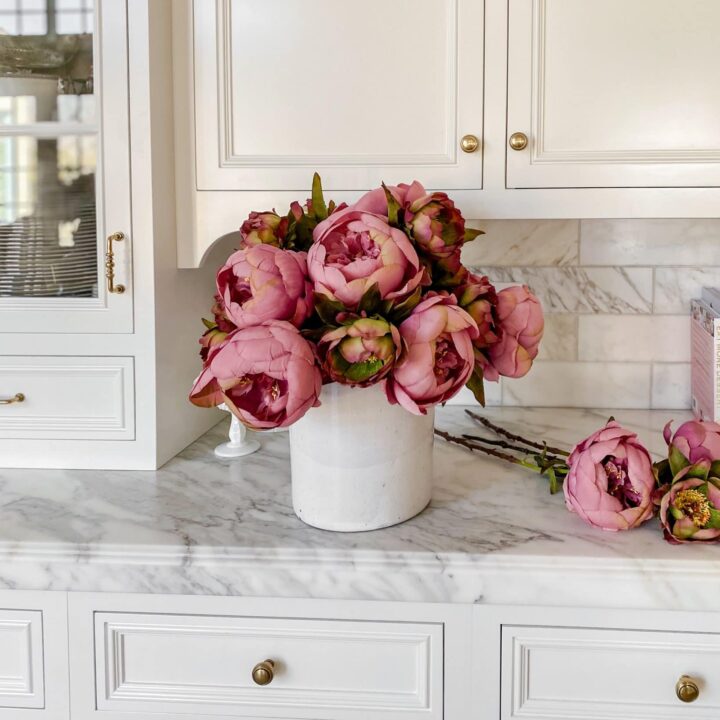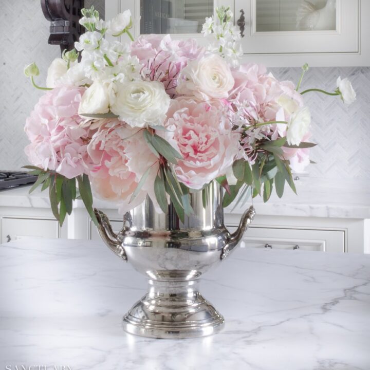 Nothing says spring has arrived quite like a silver trophy vase overflowing with soft pink faux peonies, ranunculus, and white stock flowers on a marble kitchen island.
