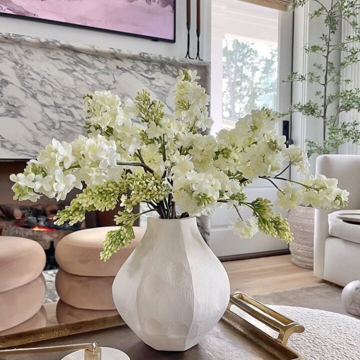 Lilac is one of the most beloved flowers of the spring season, and these white faux lilac branches arranged loosely in a textured vase bring that classic springtime charm straight into your living room.