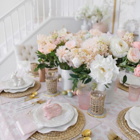 Soft pinks, delicate florals, and woven chargers create a dreamy Easter table with a natural and feminine touch.