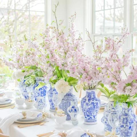 A beautiful combination of blue and white vases overflowing with pink cherry blossoms creates a striking and timeless spring setting.
